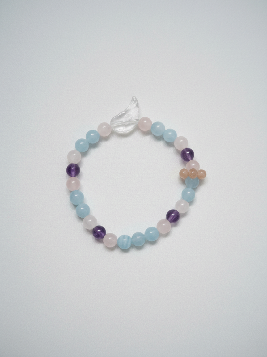 Self Love & Confidence Wishie 自愛許願手串結合了海藍寶石、粉晶、太陽石、紫水晶和白水晶,能夠開啓你的喉輪能量,提升自尊心。讓這些晶石引導你真誠地表達自我,擁抱自己的價值。